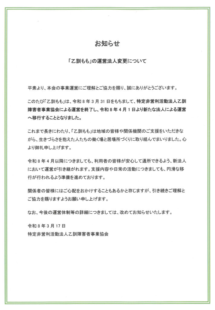 【お知らせ】2026/3/17~ 乙訓もも事業運営についてのお知らせがございます。メインページ及び乙訓もものページをご覧いただけますようお願いいたします。